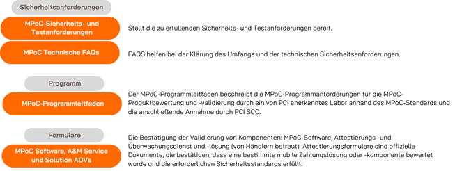 Die im MPoC-Standard beschriebenen Sicherheitsanforderungen bieten einen Standard zum Schutz der Vertraulichkeit und Integrität sensibler Zahlungsdaten, die in MPoC-Lösungen erfasst und verarbeitet werden. Dieser Rahmen ist mit Sicherheitsanforderungen, Testanforderungen und Leitlinien für Unternehmen definiert, welche an der Entwicklung, dem Einsatz und dem Betrieb von durch Händler betriebenen mobilen Zahlungsakzeptanzlösungen beteiligt sind und COTS-Geräte verwenden.