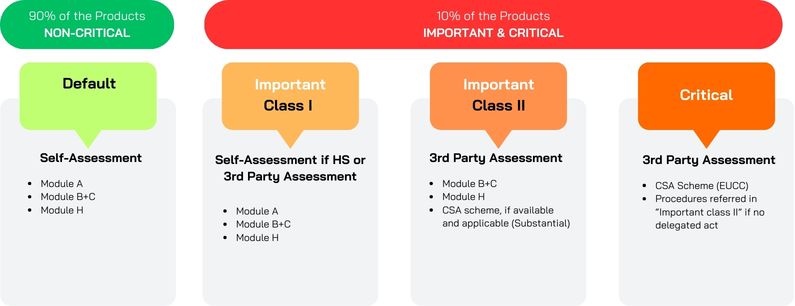 Depending on the product class category, different conformity assessments are applicable according to CRA legal text. The classification for Important Products (Class I and Class II) and Critical Products can be found in CRA-ANNEX III and IV, and more definitions in the drafted Annexes from Technical description of important and critical products with digital elements.
