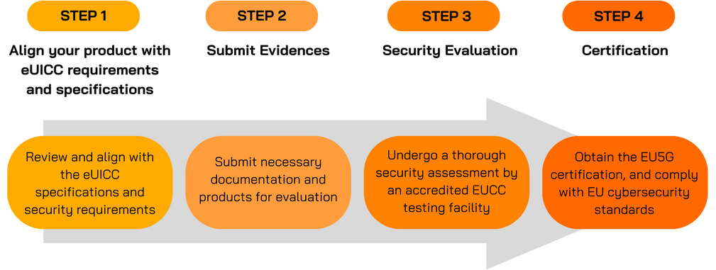 EU5G for eUICCs certification shall undergo an EUCC evaluation. Therefore, the steps for the certification process are shown here: